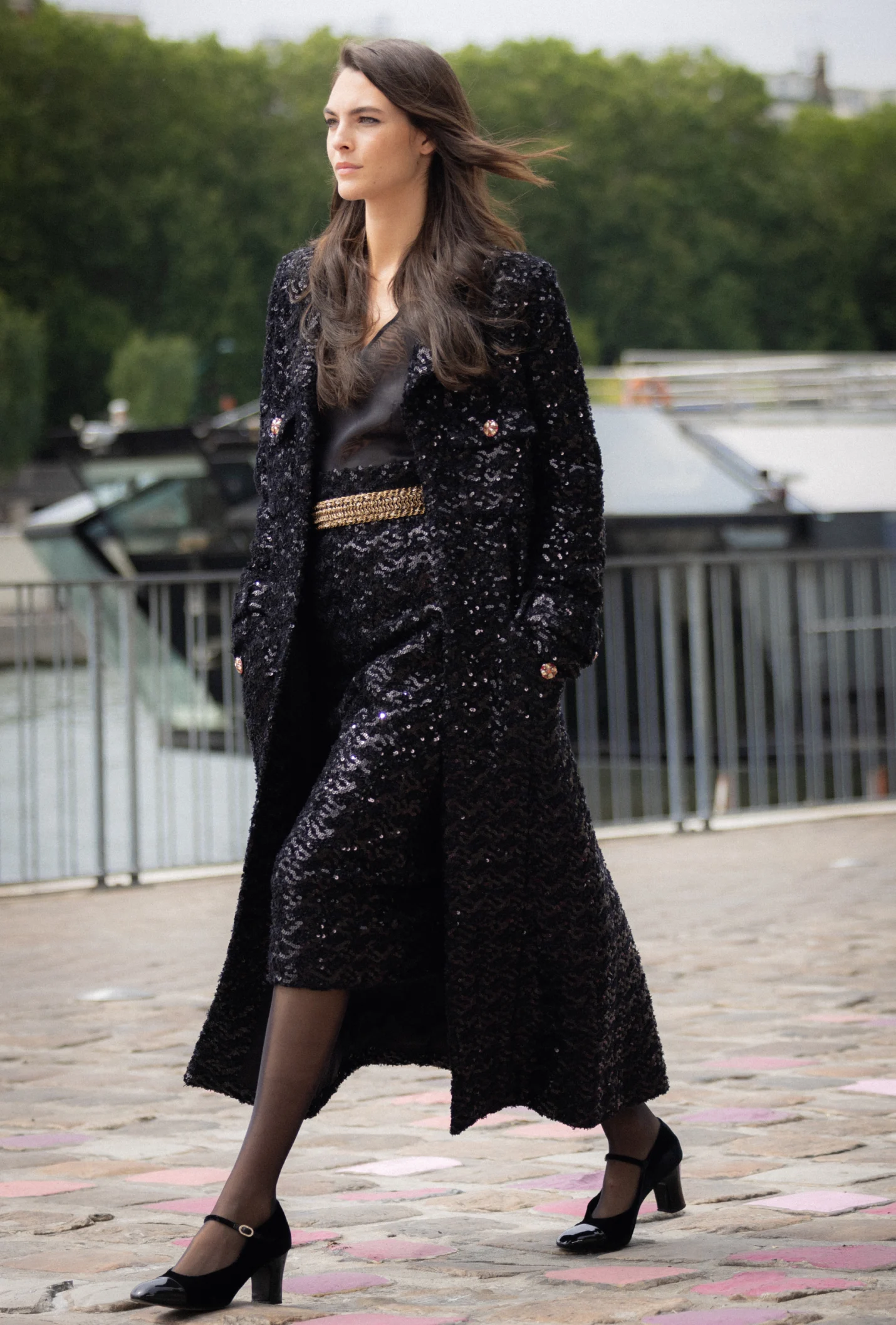 La insipiración masculina reflejada en varias piezas y sobretodo en los abrigos largos, siempre está presente desde la epoca de Coco Chanel. Blusas diáfanas ceñidas con cinturones sobre faldas de tweed dorado con pliegues planos, tops de tirantes preciosos, pantalones y chalecos de hombre de raya diplomática, un vestido largo de gasa negra de infinita ligereza, gafas pintadas y las clásicas Mary-Janes dos tonos: dorado y negro.