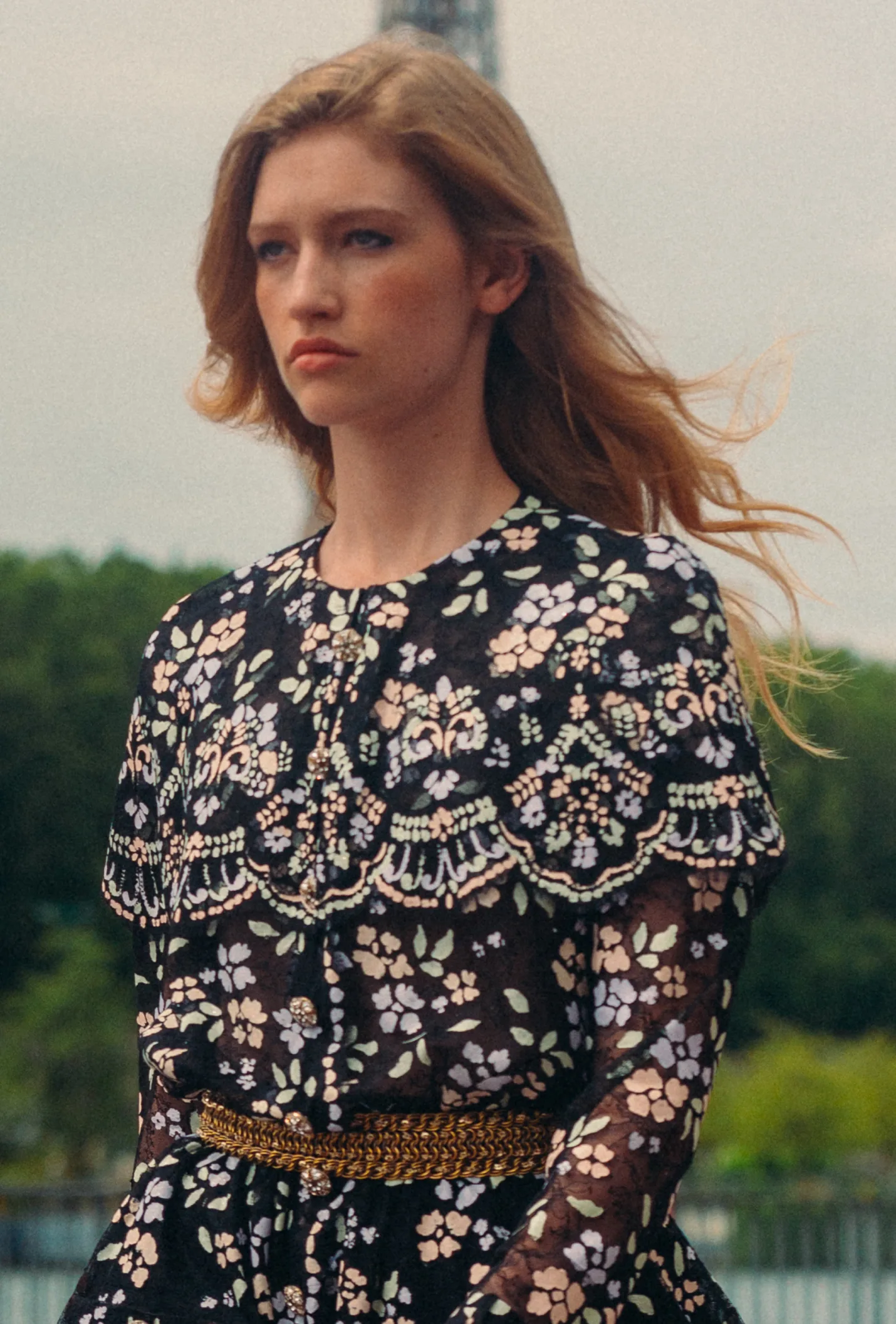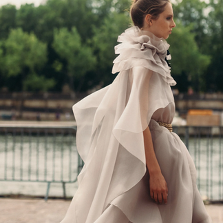 Infaltable el tweed, esta vez reinterpretado con volantes y transparencias en bajos de faldas y puños de chaquetas, gasas de seda, organzas y encajes con incrustaciones y flores pintadas a mano literalmente cada pieza una obra de arte.
